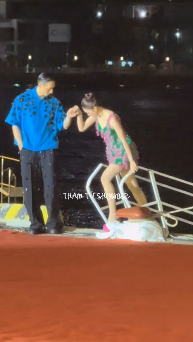 Tuy nhiên, sự cố đã xảy ra ngay từ những bước đi đầu tiên khi cô chuyển từ tàu lên bờ. Đôi giày cao gót màu hot pink nổi bật của cô đã bị tuột dây. Rất may là có 2 mẫu nam trợ diễn ở bên cạnh, một trong hai đã nhanh chóng giúp Tiểu Vy cài lại dây giày nhưng không thành công. Không còn lựa chọn nào khác, cô đành phải cố gắng giữ chân vào chiếc giày không dây để tiếp tục đi đến nhịp nghỉ đầu tiên.